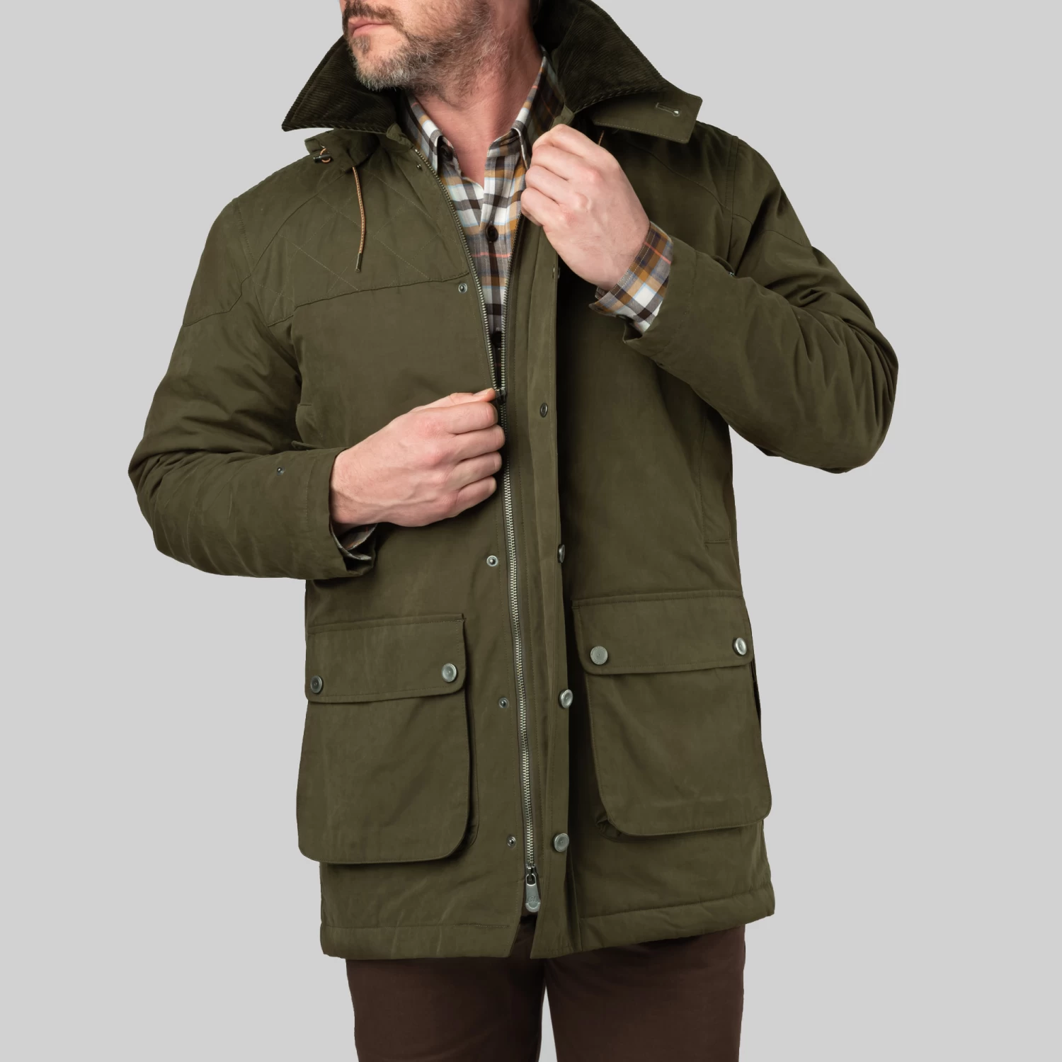 • Made in Portugal Perfectly practical and ready for every adventure, the Westley Richards Carington Dry Waxed Coat is a cut above the rest with this unique Italian fabric. Cotton made water resistant and wind repellant with a dry wax treatment and soft brushed finish makes this coat irresistible. Finished with a corduroy collar, 2 way zip, ammo inspired signature snaps and hand warmer pockets for maximum practicality. The removable hood is easily stowed in a large side pocket that doubles as a utility or game pocket.