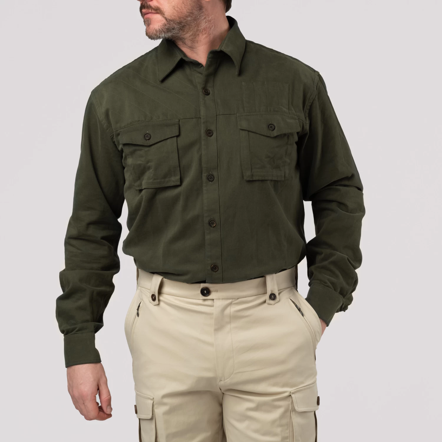 Designed entirely with the hunter in mind, its range of smart features make this the most practical Safari shirt you will ever own. Free of epaulettes so your sling doesn’t get caught when you need to change quickly from carrying to shouldering your rifle, other features include stitch checkering on the right shoulder to give you a better grip and four ammunition compartments above the breast pocket