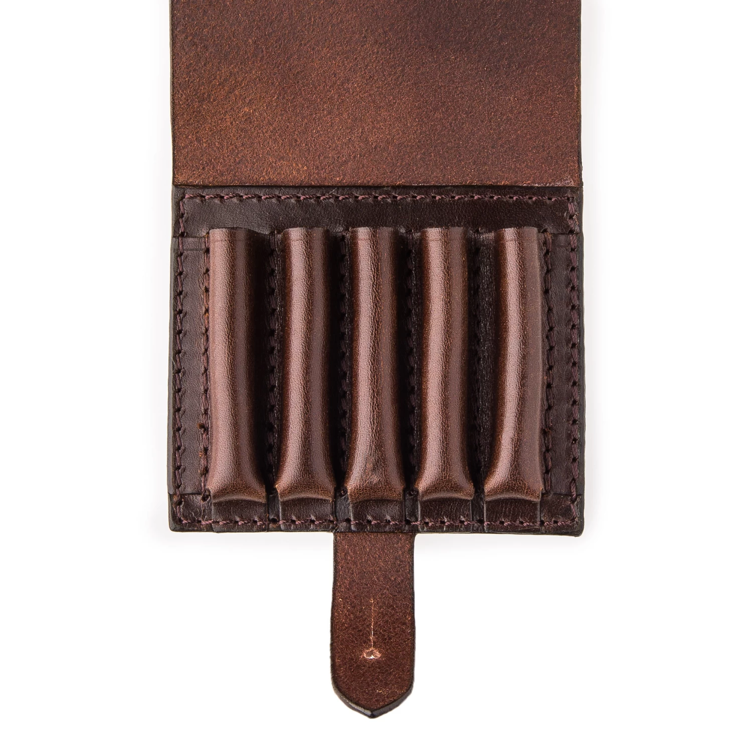Our Westley Richards 5 Round Closed Ammunition Belt Wallet will keep you organised and prepared while stalking or on safari. Designed to perfectly fit onto our 2 inch leather belt and built to carry 5 rounds of ammunition safely within reach.