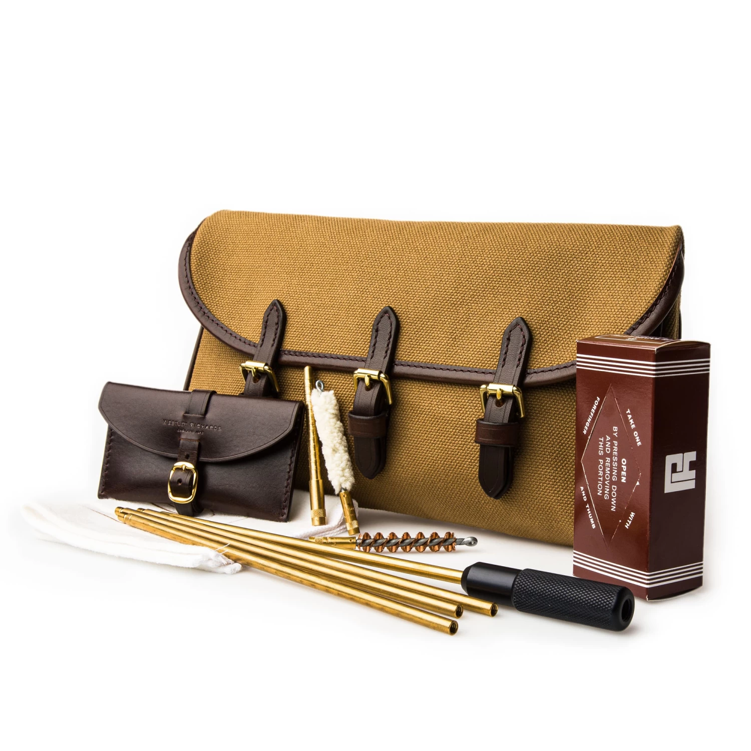 As well as offering ready access to vital cleaning tools, this tremendously useful pouch can also store other small items, including photography accessories and a first aid kit, ensuring they are always to hand. Featuring three brass buckles for secure closure, it comes complete with a jag, mop and brush with matching leather pouch as well as all the essentials for maintaining your gun or rifle.